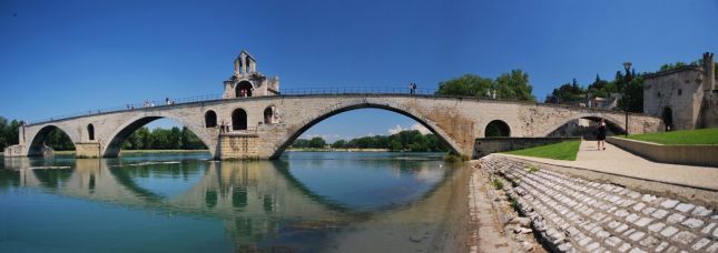 Démantelé en 1226, reconstruit et plusieurs fois emporté par le Rhône, son utilisation est abandonné au 17e s. Il comporte aujourd’hui quatre arches et une chapelle dédié à saint Nicolas. Il est célèbre de part le monde grâce à la chanson enfantine "Sur le pont d’Avignon".